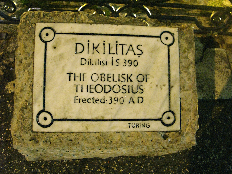 No centro da praça, ergue-se um enorme obelisco egípcio. O cume perde-se na escuridão da noite com os hieróglifos a lembrar a sua origem. Foi Teodósio, o Grande, que fez transportar nos finais do século IV o monumento em granito rosa que fazia parte do Templo de Karnak em Luxor (1500 a.C). Para registar a sua marca pessoal, Teodósio colocou o obelisco num pedestal de mármore com cenas do imperador e da sua família a apreciar as corridas..
