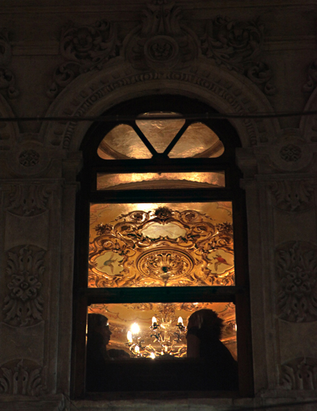 O impacto começa logo à entrada da porta imperial que nos abre um jogo de abóbadas, colunas, arcos por entre os quais se vislumbra o ouro dos ícones: a virgem Maria e o menino, imperadores, imperatrizes, o arcanjo Gabriel… Vertigem é o termo que se pode dizer da sensação que se experimenta quando no centro do monumento olhamos para cima. Respirar fundo será a melhor forma de resistir ao sufoco das alturas, ao impacto da arquitectura, ao olhar fixo das figuras.