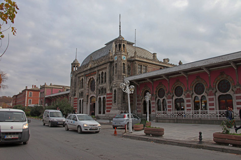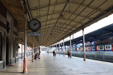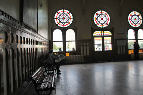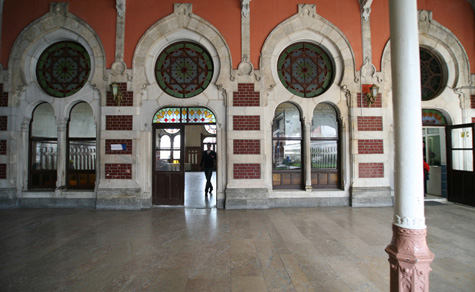 Quando percorremos o cais onde continuam a chegar os comboios vindos da Europa e da cidade de Erdine, procurámos o ambiente de outros tempos. Mas, apesar do relógio Nacar, do sino que outrora dava o sinal de partida, dos bancos, das colunas, a modernidade das novas composições não permite devaneios. Tivemos de ir ao salão onde se guardavam as bagagens para retomar o tempo de outros tempos: o silêncio do sítio, a penumbra, as cores quentes dos vitrais, o chão brilhante… Um solitário leitor de jornal parece que ficou esquecido no tempo, nem dá conta da nossa presença.